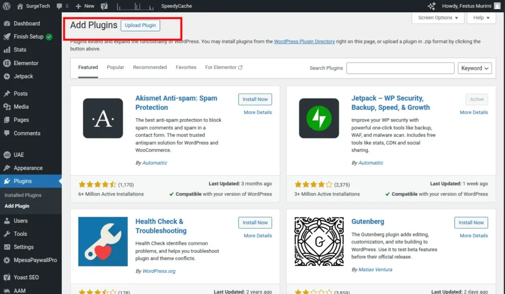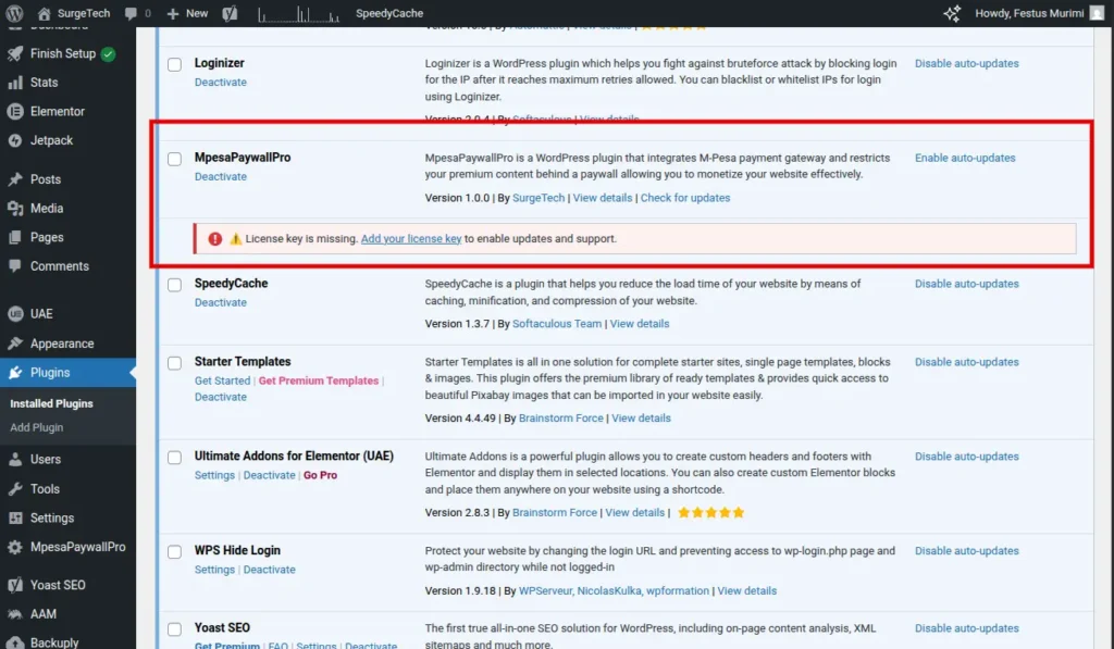 To confirm MpesaPaywallPro is active, navigate to the “Plugins” section in your WordPress sidebar and select “Installed Plugins.” MpesaPaywallPro should appear in the list. An active plugin is typically highlighted.
