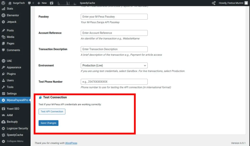 After saving, click the “Test API Connection” button. Click this button to initiate a connection test to M-Pesa using the credentials you provided.