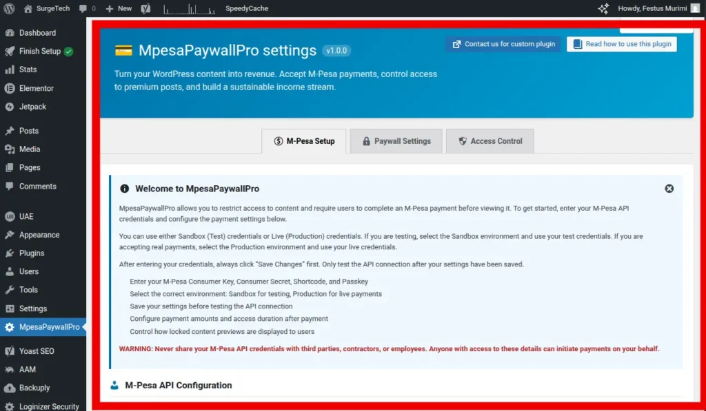 In your WordPress dashboard sidebar, you’ll now see a new menu item called “MpesaPaywallPro“. Click on it. You’ll be taken to the Plugin’s Plugin’stings page, where you’ll see three tabs at the top: “M-Pesa Setup“, “Paywall Settings“, and “Access Control.“