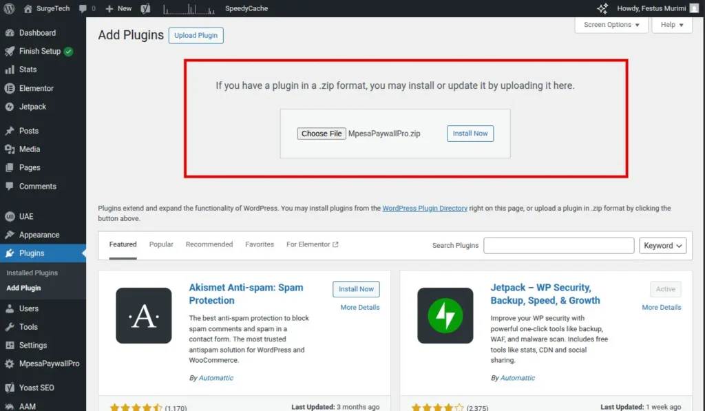 The page will change to show you a file upload interface. Click the “Choose File” button and locate the MpesaPaywallPro.zip file you downloaded. Select it, then click “Open”. Finally, click the “Install Now” button.